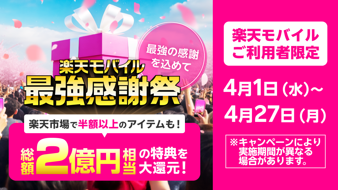 楽天モバイルは、同社ユーザーを対象に総額2億円相当の特典を進呈する「楽天モバイル 最強感謝祭」を開始した。期間は4月27日9時59分まで。