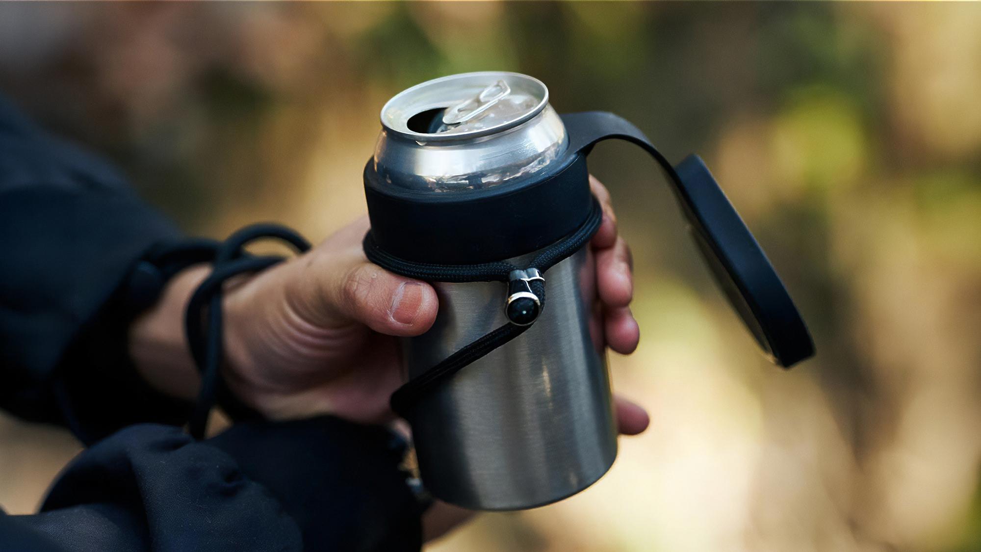 真空二層構造で冷たい・温かいをキープ。フタでこぼれや虫の侵入もブロックできる便利仕様。市販缶の97%に対応し、首掛けストラップでハンズフリーできて便利。先行割引価格で販売中